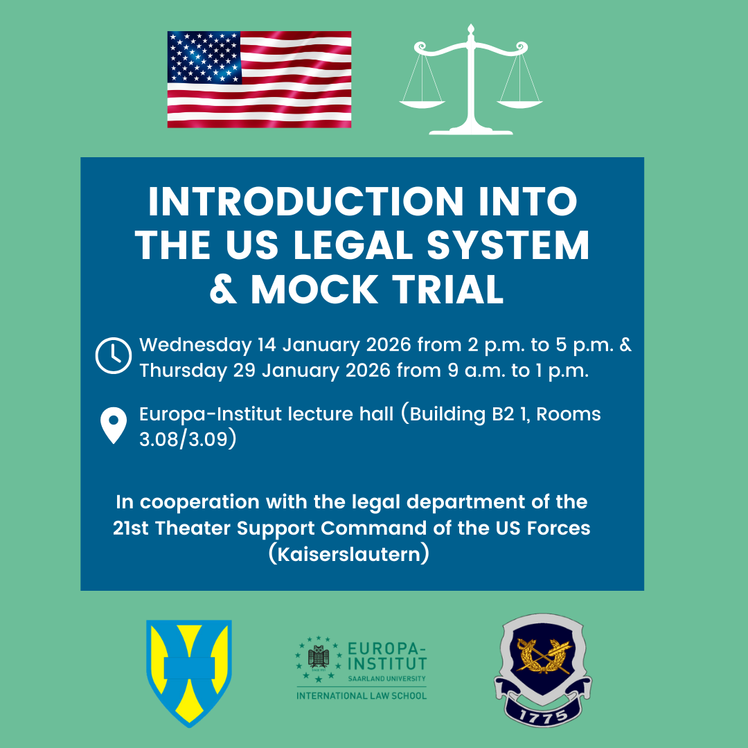 In cooperation with the 21st Theater Support Command of the US Forces, Ramstein Air Base, the Europa-Institut offers a Comparative Law Introduction to the legal system of the USA and the Rule of Evidence in American Courts with the title "An Introduction into American Law & Mock Trial".