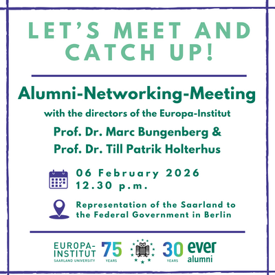 In 2026, the Europa-Institut celebrates its 75th anniversary and our alumni association EVER e.V. 30 years. To kick off this special year, we are delighted to invite our alumni to an Alumni Networking Meeting in Berlin.