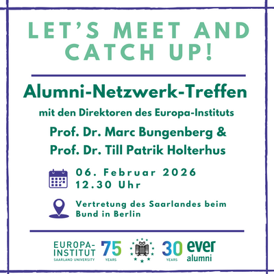 2026 feiern wir 75 Jahre Europa-Institut und 30 Jahre EVER. Zum Auftakt dieses besonderen Jahres laden wir unsere Alumni herzlich zu einem Netzwerktreffen in Berlin ein.